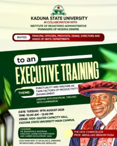 The Vice Chancellor, Kaduna State University, invites all Principal Officers, Provosts, Deans, Directors, and Heads of Units/Departments to a free training facilitated by the Institute of Registered Administrative Managers of Nigeria (IRAMN).
