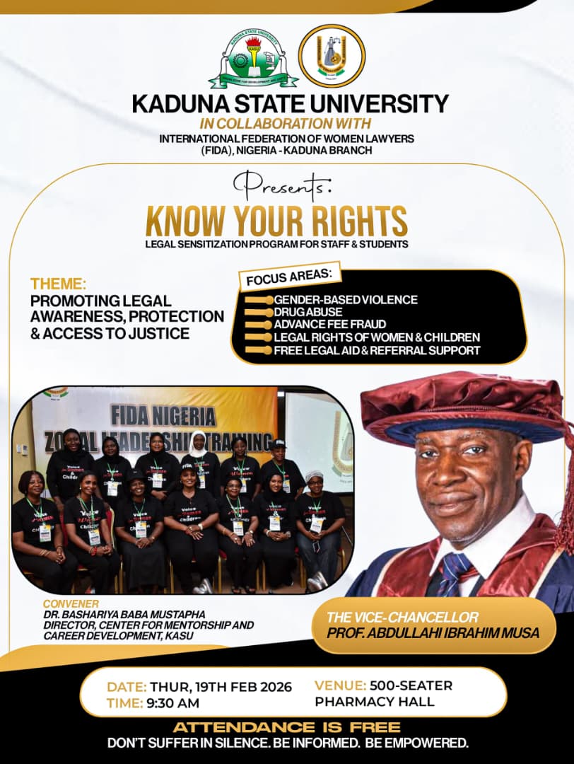 Kaduna State University, in collaboration with FIDA, presents a Sensitization Programme on pressing social and legal issues affecting our community.