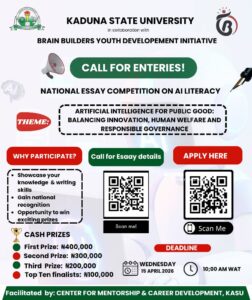 The Center for Mentorship and Career Development, Kaduna State University invites all students to participate in the National Essay Competition on AI Literacy organized by Brain Builders Youth Development Initiative (BBYDI).